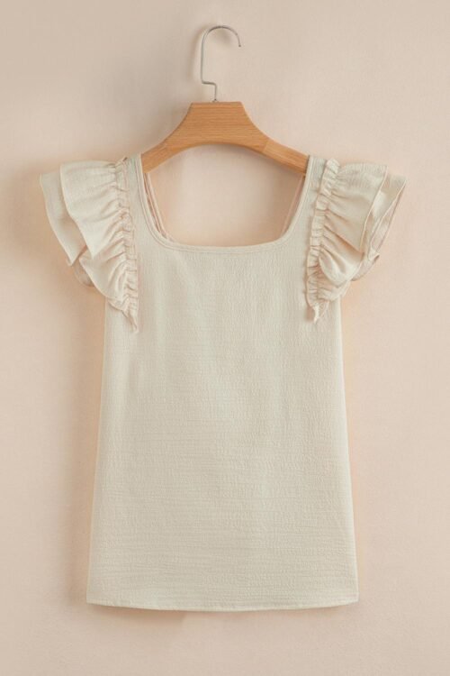 - Embrace Timeless Elegance With This Beige Blouse Featuring Delicate Frilled Ruffle Sleeves For A Touch Of Femininity.