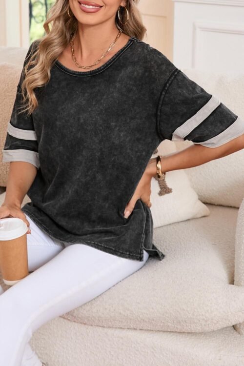 - Embrace A Classic Look With A Twist In This Black Vintage Stripe Sleeve Cotton T-Shirt, Perfect For Casual Outings Or Laid-Back Days.